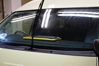 右側側面のガラスに撥水コーティング施工中でございます。 |