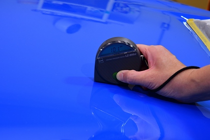 新車でございますので、塗装が減るような磨きは行いませんが、参考まで塗装の厚みを計測してから磨き工程に入ります。塗装の厚みは、全体的には90~110µm前後でございました。 写真の場所ですとミリ単位にしますと0.101mmでございます。塗装は大切でございます。 |