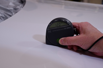 新車でございますが参考まで塗装の厚みを計測してから磨き工程を開始致します。塗装の厚みは、全体的には110~130µm前後でございました。 写真の場所ですとミリ単位にしますと0.12mmとなります。 新車の場合の磨きは、大切な塗装を削るような磨きは行いませんのでご安心下さいませ。 |