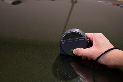 こちらは、ボディの磨き工程を行う前に、ボディの塗装の厚みを計測している様子でございます。塗装の状態を確認してから磨かせて頂きます。 |