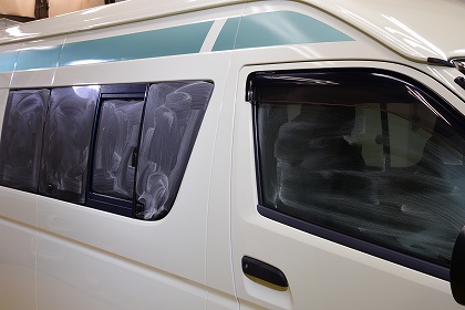 右側側面のガラスに撥水コーティング施工中でございます。 |