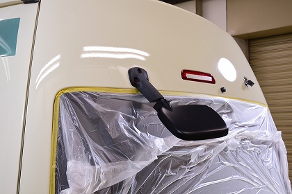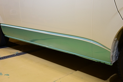 4日目左側面の磨き完了致しました。 こちら側は雨の水が垂れた跡(黒ずみ)が少し残っておりましたが、綺麗になってございます。 こちら側も気になった部分はタッチアップペイントさせて頂きました。 |