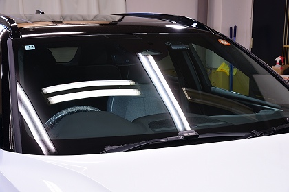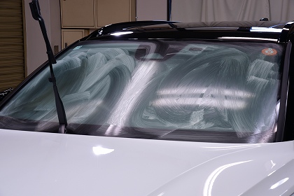 これよりウィンドガラス撥水コーティングを施工させて頂きます。フロントガラスには「ハイグレード撥水コース」を施工中でございます。 |