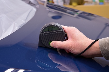 新車ですので塗装を削るような磨きは行いませんが参考まで、塗装の厚みを測ってから磨き工程にはいります。塗装の厚みは、全体的には90~100µm前後でございました。 写真の場所ですとミリ単位にしますと0.094mmとなります。塗装は大切でございます。 ※だからと言って塗装の厚みが厚過ぎるのも良くないらしいです |