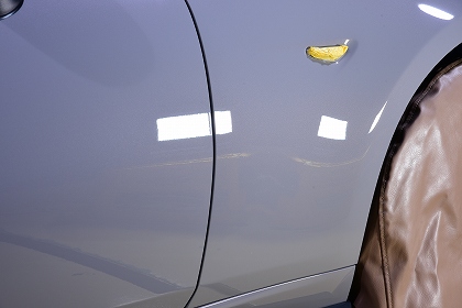 まずボンネットを磨かせて頂きました。一見したところでは、糊残りなどは確認できない状態に見受けられましたが、磨きの照明環境下で細部まで確認したところ、わずかではございますが糊の残留が見受けられました。 もちろん、適切に磨き処理を行い、現在は美しい状態に仕上がっておりますのでご安心ください。 なお、搬送時に使用された保護シートの跡も確認されましたが、こちらも問題なく除去し、綺麗になってございます。 |